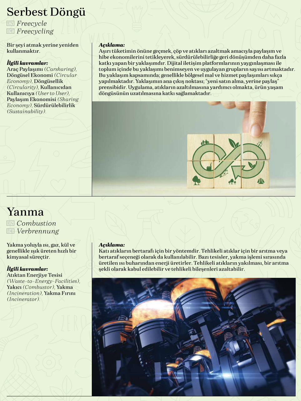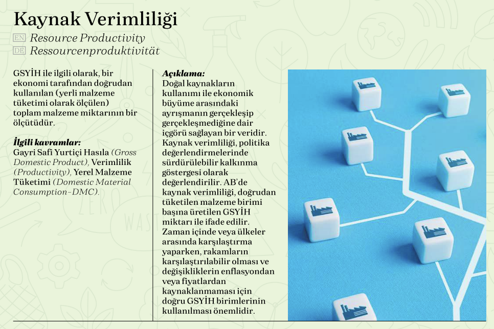İklim değişikliği, biyoçeşitlilik kaybı, çevre koruma, yenilenebilir enerjiler, sera gazları gibi konuları neredeyse her gün duyduğumuz bir dünyada yaşıyoruz. Bu ve benzeri konular; ekonomik, çevresel, sosyal ve yönetsel başlıklarından oluşan sürdürülebilir kalkınma ile yakın ilişkideler. Sürdürülebilirlik, kapsamı sürekli gelişen, dinamik bir süreç ve sürdürülebilirlik kavramları birçok devlet, şirket, yatırımcı, işletme için merkezi bir konuma gelmiş durumda. Ülkemizde, özellikle imalat/ihracat yapan iş dünyasının sürdürülebilirlik politikası araçları ve sürdürülebilirlikle ilgili gelişmeleri yakından takip etmesi, ilgili kavramları bilmesi ve bu alandaki gelişmelere uyum sağlaması da öncelikli hale geldi. MAİB’in hazırladığı Yeşil Terimler Kılavuzu, birçok uluslararası kaynaktan alınan ve şirketlere ve diğer kullanıcılara yararlı olabilecek önemli terimleri, Türkçe, İngilizce ve Almanca dillerindeki tanımları, açıklamaları ve ilgili kavramlarıyla https://green-glossary.com/ internet adresinden okurlarına sunuyor.